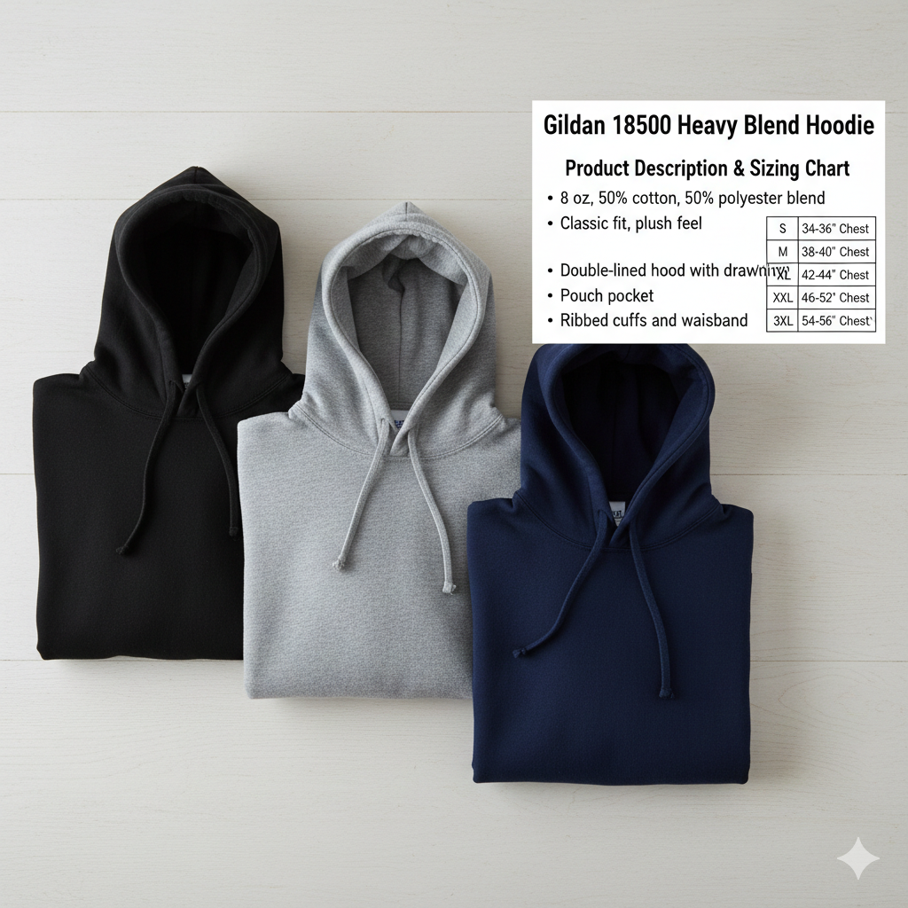 The Gildan 18500 Heavy Blend Hoodie is a standard choice for custom apparel because it balances comfort, durability, and value. It features a classic fit and a soft, pill-resistant finish.